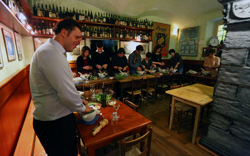 Attività di team building culinaria con preparazione del pesto nel mortaio.